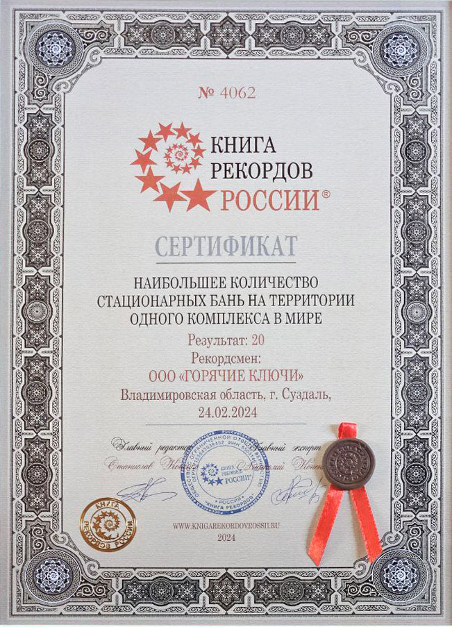 Русская баня на дровах не только место для очищения души и тела. Это традиция отдыха и оздоровления, которую возрождает экоотель в Суздале «Горячие ключи». На его территории находится легендарный комплекс , знаменитый теперь не только своим сервисом и радушной атмосферой. В феврале 2024 года он стал первым в мире по количеству стационарных бань!