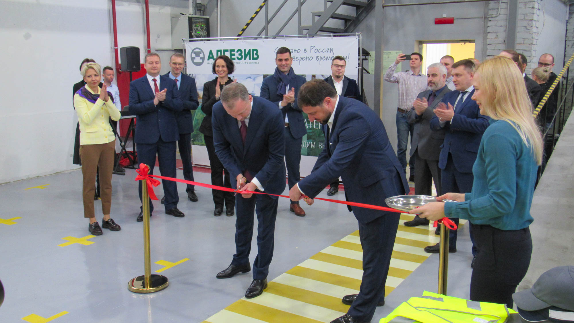Новый цех по производству герметиков научно-производственной фирмы «Адгезив» разместился в одном из бывших зданий владимирского завода железобетонных конструкций, в северной промзоне Владимира на улице Промышленный проезд. Торжественное открытие цеха прошло сегодня, 9 ноября. Резали ленточку, нажимали символическую кнопочку и участвовали в прочих торжественных процедурах первый заместитель губернатора Владимирской области Александр Ремига, вице-мэр города Владимира Глеб Серегин, генеральный директор ООО «Сен-Гобен Строительная Продукция РУС» Рафаэль Зохрабян, операционный директор Оливье Дерош.