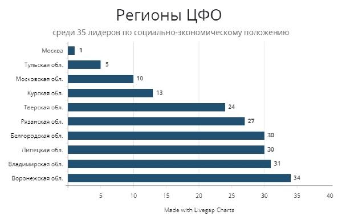 Среди 35 лидеров почти треть составляют регионы Центрального федерального округа (ЦФО). Первые пять позиций заняли Москва, Тульская, Московская, Курская и Тверская области, продемонстрировавшие высокие экономические результаты в прошлом году.