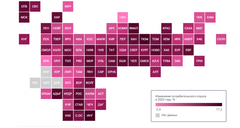 Примечательно, что даже в тех регионах ЦФО, которые оказались ниже, уровень потребительских расходов был выше нашего, даже в Ивановской области: 67 место - Ивновская обалсть (30 тыс. рублей), 76 место - Костромская область (31 тыс. рублей), 79 место - Курская область (30 тыс. рублей), 81 место - Липецкая область (33,9 тыс. рублей), 83 место - Белгородская область (32,6 тыс. рублей), 84 место - Брянская область (31,3 тыс. рублей). Все они оказались внизу рейтинга потому, что рост потребительского спроса в 2023 году к уровню 2022-го у них оказалася ниже наших 2%, а в Белгородской и Брянской областях - вообще отрицательным. Что, с учетом их прифронтовой позиции, вполне понятно.