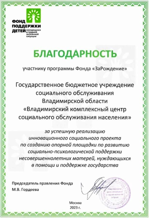 За успешную реализацию в 2021-2022 гг. инновационного социального проекта по созданию опорной площадки по развитию социально-психологической поддержки несовершеннолетних матерей «Маленькая мама» Владимирский комплексный центр социального обслуживания населения поощрен благодарностью Фонда.