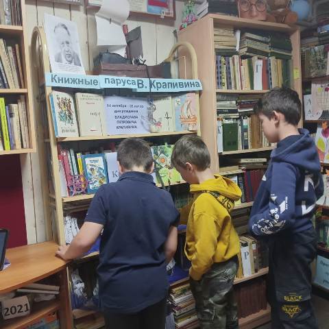 Также была подготовлена книжно-иллюстративная выставка «Книжные паруса В. Крапивина». Книги В.Крапивина учат добру, дружбе, верности. Мир приключений и романтики, присущий произведениям В.П.Крапивина, привлекает ребят к более близкому знакомству с его книгами. Произведения автора — увлекательное путешествие в мир, где главные герои являются примером, на которых равняются мальчишки и девчонки. Они всегда защитят слабого, помогут попавшему в беду, умеют постоять за свою честь.