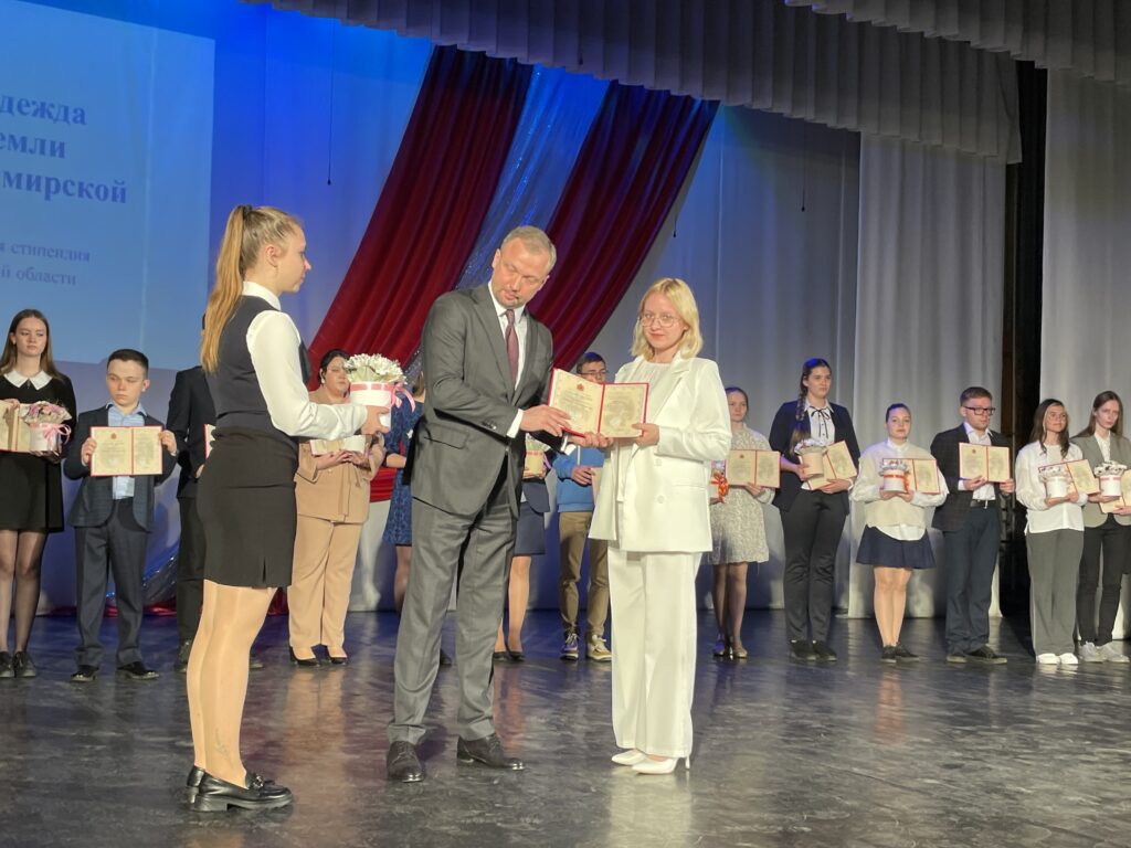 25 апреля во Владимирском областном колледже культуры и искусства прошла торжественная церемония вручения стипендий Правительства Владимирской области «Надежда Земли Владимирской» – 2023. В зале собрались учащиеся, студенты, воспитанники учреждений культуры и спорта, педагоги, родители. Почетными гостями церемонии стали первый заместитель Губернатора Владимирской области Александр Ремига, заместитель председателя Законодательного собрания Дмитрий Рожков, Министр образования и молодежной политики Владимирской области Светлана Болтунова.
