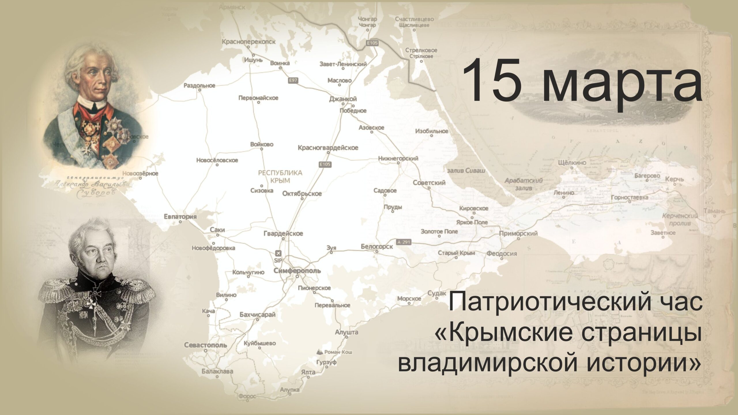 «Крымские страницы владимирской истории» — патриотический час, посвящённый Дню воссоединения Крыма с Россией, пройдет во Владимирской областной научной библиотеке 15 марта 2023 года.
