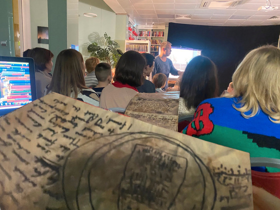 В читальном зале все началось с представления под названием «Дневник Робинзона» от «Театра Т» из Москвы. Это была необычная постановка для классического понимания моноспектакля. Во всем присутствовал интерактив. Зрители не только читали дневник главного героя (по залу пустили трехметровый пергамент якобы с его записями) - известный на весь мир сюжет оживили, сделав зрителей гостями Робинзона. Помогли в этом соленая вода далеких морей, песок с острова, корабли и разные фигурки.