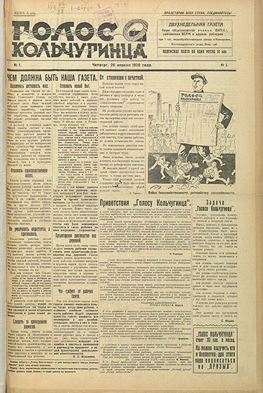 Уважаемые читатели! Нашей газете «Голос кольчугинца» исполняется 95 лет. Возраст солидный. Газета вышла в свет, когда еще не было на карте города Кольчугино, а был рабочий поселок. Поэтому на шапке первого номера стоит подзаголовок: двухнедельная газета бюро общезаводской ячейки ВКП(б), райзавкома ВСРМ и кружка рабкоров при 1 государственном медеобрабатывающем заводе в Кольчугине Александровского уезда Влад. губ. Газета имела 4 полосы формата А3, печаталась во Владимире. Тираж в выходных данных почему-то не указан, зато стоит номер гублита (советской цензуры). Также указывается ответственный редактор Гельбрас Г.С., зам. отв. редактора Федин С. Можно отметить также, что все полосы свёрстаны в пятиколоночном формате.