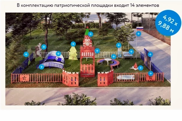 Патриотическая площадка – это не вспомогательный декоративный элемент, который дополняет общую архитектуру территории, а самостоятельный развивающий комплекс, собравший все необходимые материалы для проведения занятий на улице. Его концепцию разрабатывали действующие педагоги дошкольного образования, а включенные в состав площадки элементы направлены на развитие патриотических чувств у подрастающего поколения.