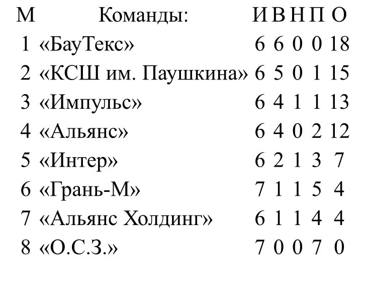 В праздничный день, 23 февраля, мужские команды соревновались в рамках чемпионата города по мини-футболу. В центральном матче тура команды «Импульса» и «КСШ им. А.В. Паушкина» показали яркий интересный футбол на радость многочисленным болельщикам. В данной игре победу в упорной борьбе одержала команда «КСШ им. А.В. Паушкина» 5:4. Футболисты «Альянса» продолжают закрепляться в лидирующей четверке после уверенной победой над командой «Грань-М» 10:5. Свою первую победу одержал коллектив «Альянс Холдинг», переиграв команду «О.С.З.» 8:3. Так же, 22 февраля, в переносной игре «Грань-М» оказался сильнее «О.С.З.» 5:3.