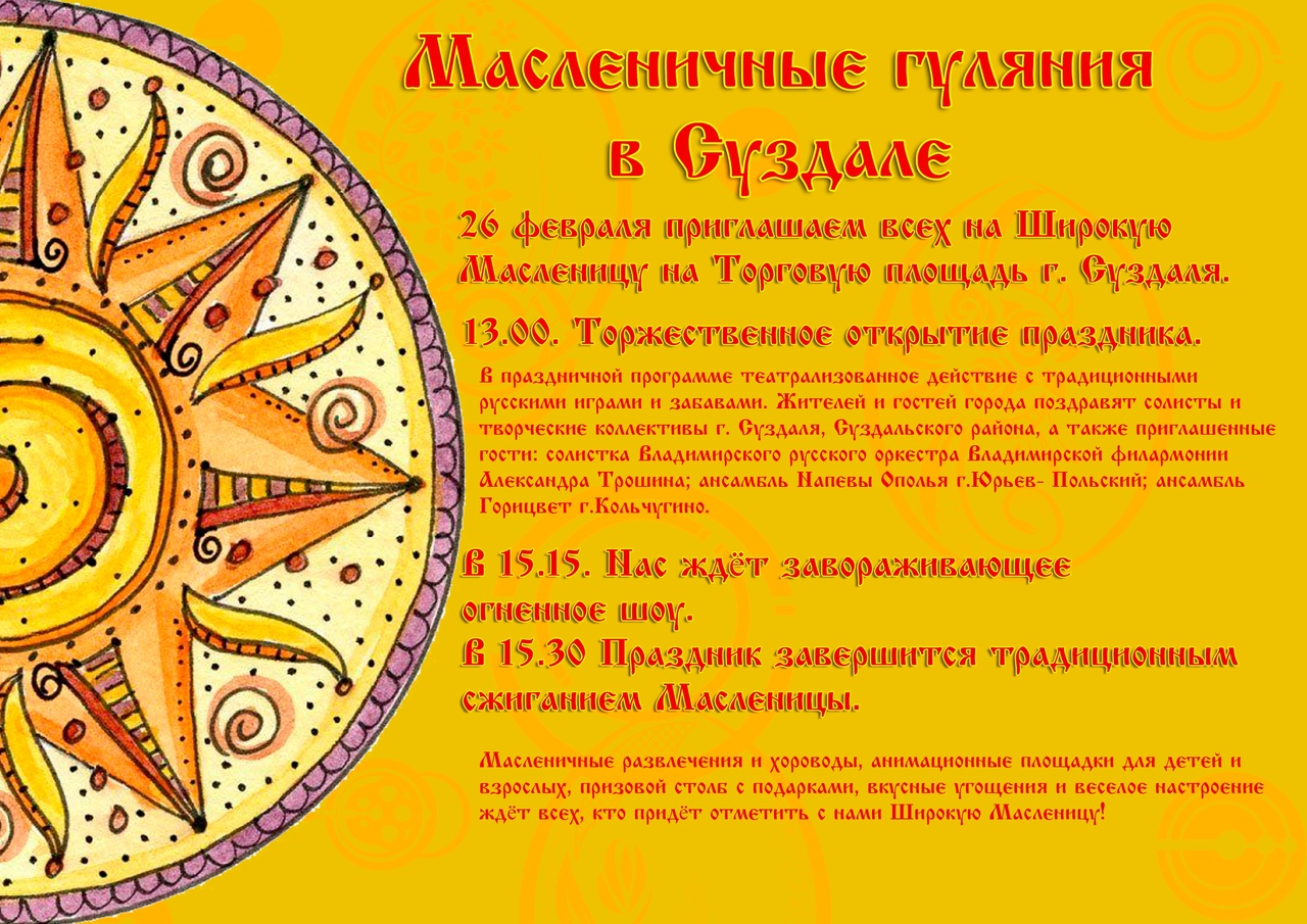 Друзья! В Прощеное воскресенье приглашаем Вас на проводы русской зимы, на Торговую площадь города Суздаля!