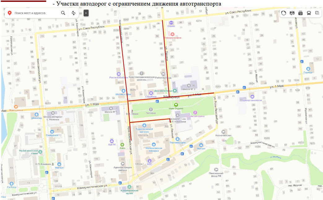 В соответсвии с постановлением администрации Меленковского района №1456 от 18.09.2023 года в целях профилактики правонарушений, обеспечения безопасности граждан, безопасности дорожного движения и дополнительных мер по усилению антитеррористической защищенности в местах проведения массовых мероприятий в период празднования районного Дня картофеля 23 сентября 2023 г. в период с 7.00 час. до 15.00 час . будет перекрыто движение транспортных средств на следующих участках автодорог в г. Меленки: