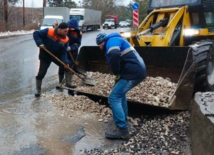 Идет ямочный ремонт щебнем ул. Социалистической и Свердлова.