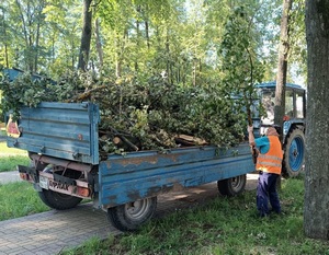 Бригада рабочих убирает скверы и контейнерные площадки от мусора.