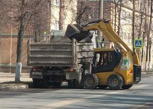 Проводятся работы по уборке смёта на ул. Строителей (участок от ул. Ватутина до ул. Комсомольской). Задействованы погрузчик с щёткой и бункером, погрузчик ANT-1000 и МАЗ.