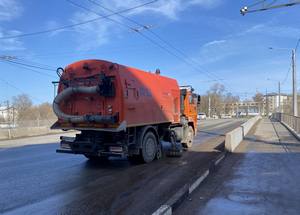 Подметальная уборочная машина (пылесос) задействована на механизированной уборке смета вдоль бордюрного камня и осевых линий на ул. Строителей, ул. Кирова, пр.Ленина, ул. Лопатина.