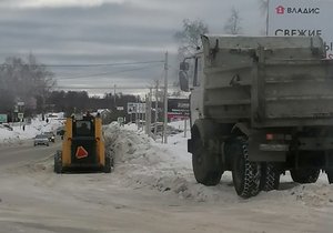 На ул. Ватутина на участке от ул. Строителей до ул. Еловой осуществляются работы по вывозу снега. Задействованы погрузчик и МАЗ.