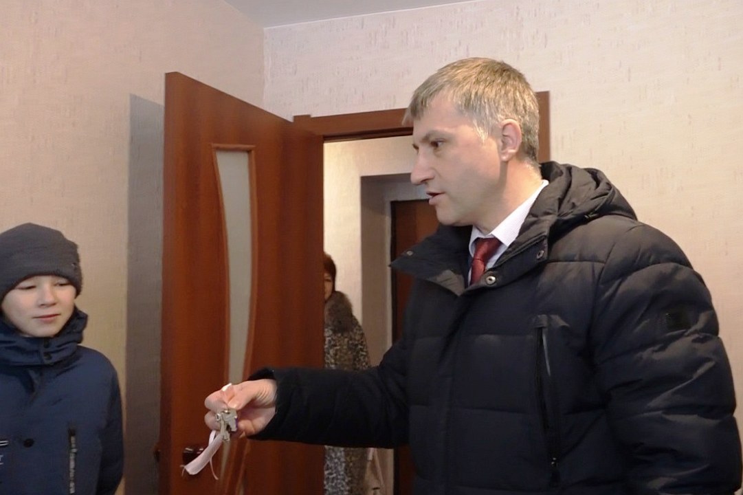 Глава города Алексей Соколов вручил документы и ключи дружной семье Байковых, в которой подрастают четверо детей.