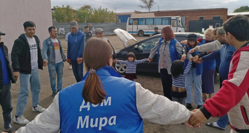 Они приехали во двор общежития для трудовых мигрантов - хрупкие девушки в синих жилетах "Дома Мира" - и огорошили отдыхавших после работы мужчин из Узбекистана: "А давайте поиграем?". Мужчины сначала смущались, но потом встали в хоровод. Прибежали детки, жены выглянули из окон с мобильниками наизготове для фотографирования, и все пошло как в песне: "Ну, а дружба начинается с улыбки!"
