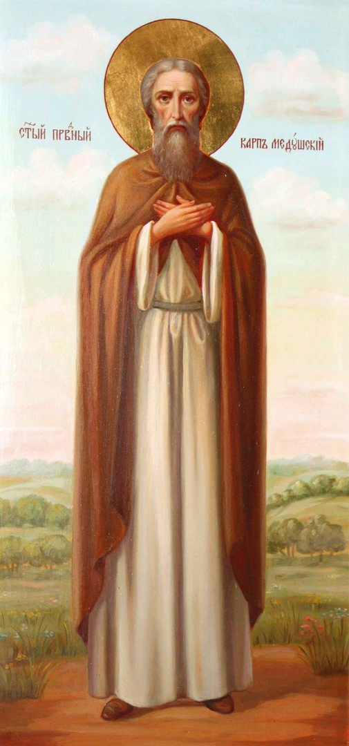 Воссоздан и образ святого Карпа Медушского. Праведник сурово глядит на потомков, словно укоряя за суету и безумства, творимые неразумными наследниками Третьего Рима. Но если вглядеться пристальнее, то, кажется, что лик старца смягчается, а во взгляде угодника — удовлетворение от зримого проявления торжества духа над плотью, чему свидетельством и стало возрождение почти уничтоженного погоста. И как никогда не прекратится празднование Медового Спаса, так и с карты уже не исчезнет запоминающееся и радующее глаз название — Медуши.