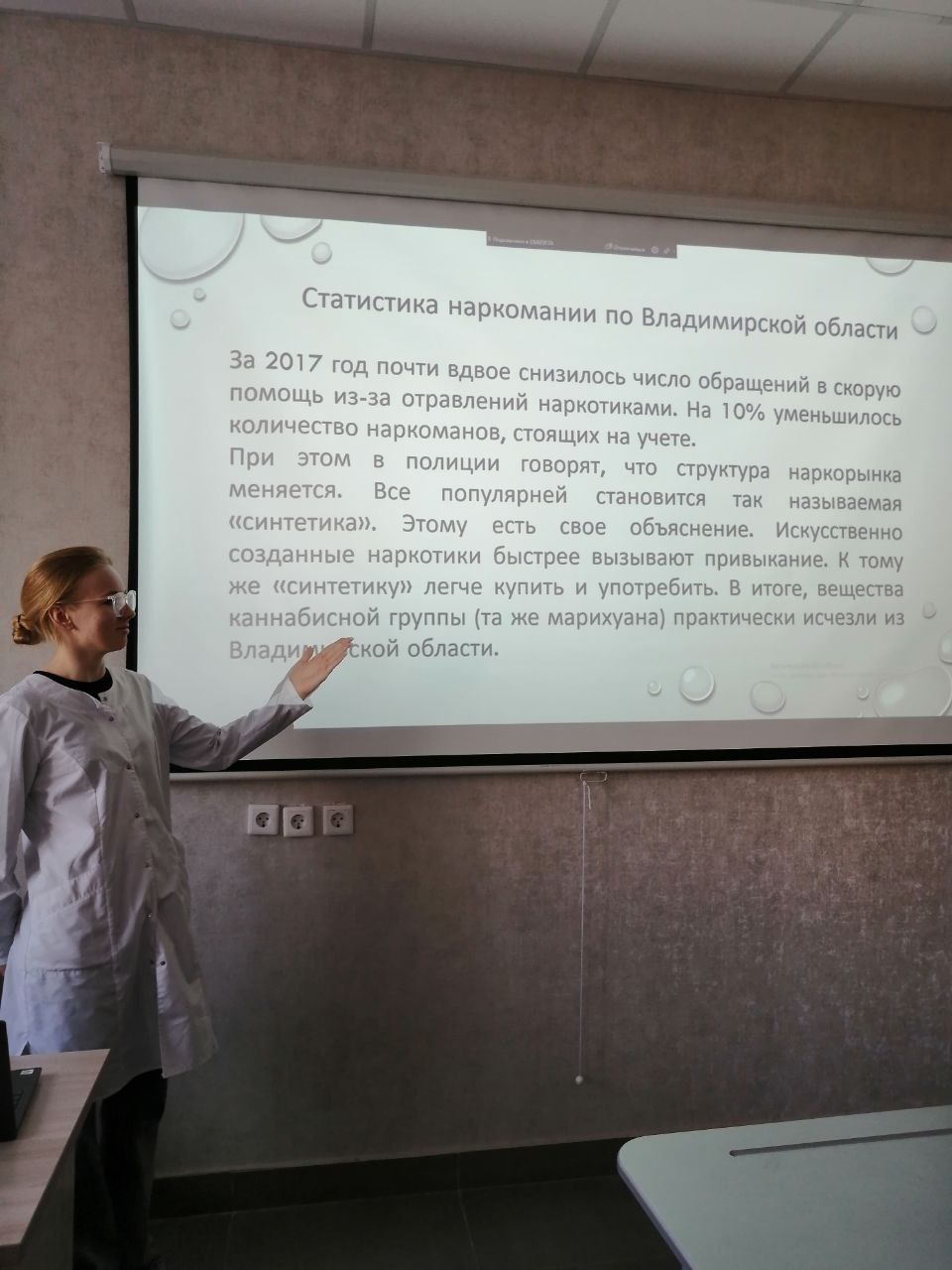 В ходе встреч с врачом-наркологом ГБУЗ ВО «Владимирский областной наркологический диспансер» на тему «Аддиктология. Введение. Практические навыки» студенты разбирали виды зависимостей, причины возникновения, способы лечения и помощи наркозависимым, говорили о новой болезни Evali, феномене созависимости.