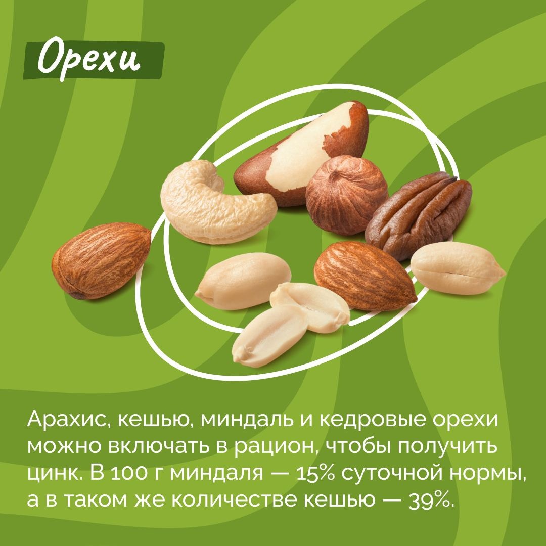 - Орехи и семена: Тыквенные семечки, кешью и миндаль являются хорошими растительными источниками цинка.