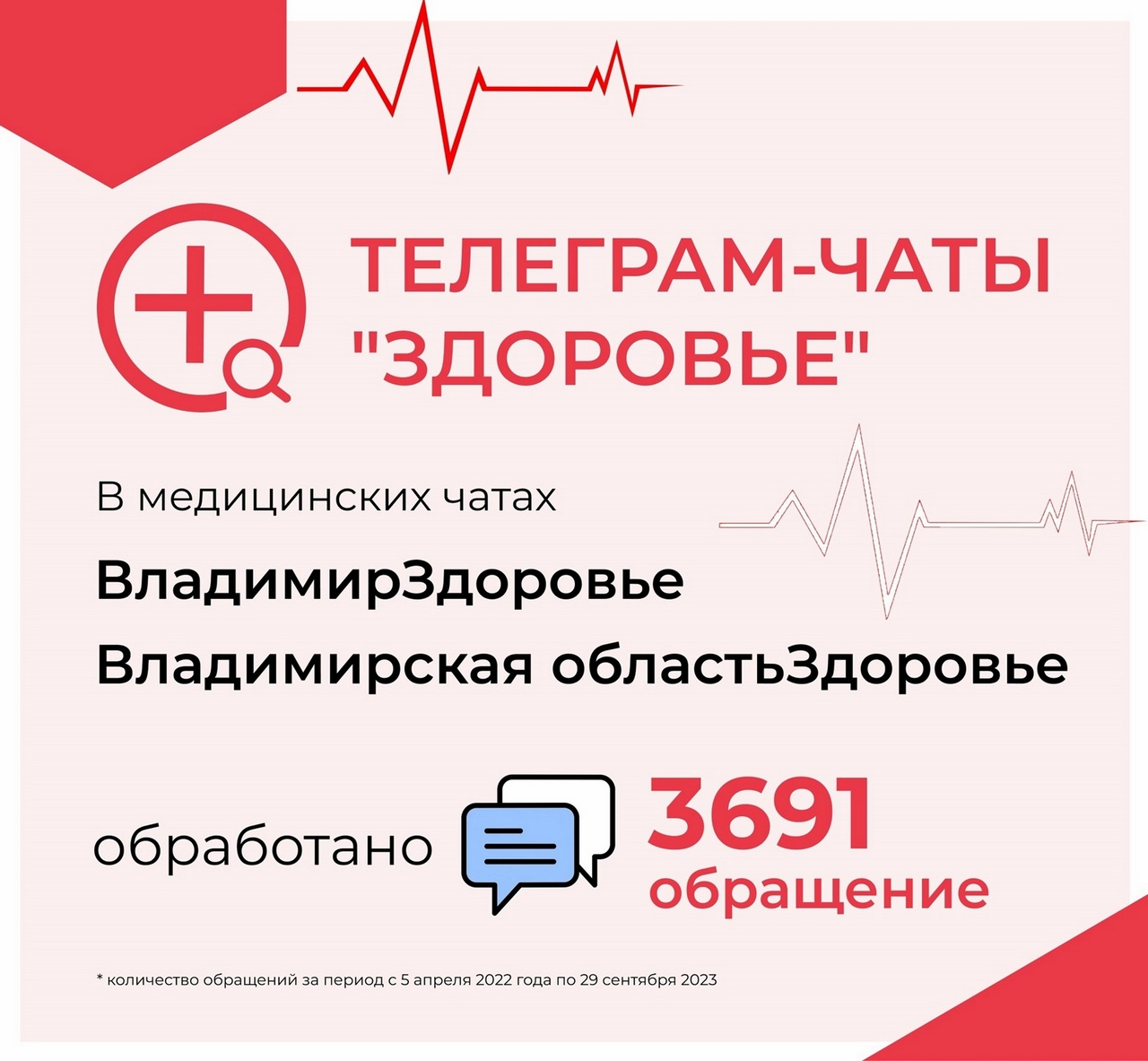 За время работы телеграм-чатов во Владимирской области от жителей региона поступило почти 3700 обращений. Основные темы – запись к врачам и оказание медицинской помощи. В общей сложности в двух чатах обрабатывается в среднем до 350 обращений в месяц. Наибольшую активность в использовании медицинских чатов проявляет население Владимира, Александровского и Ковровского районов.