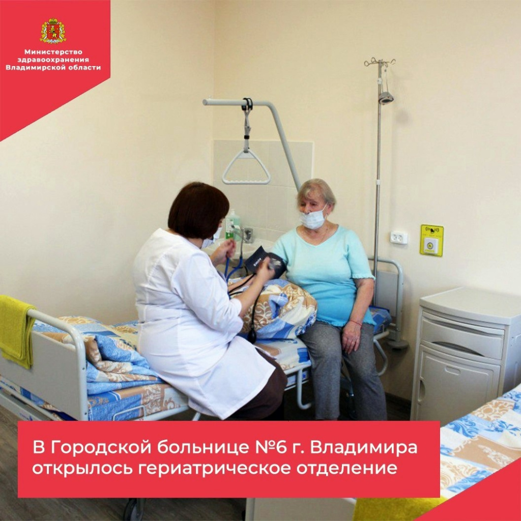 Как сообщает пресс-служба Правительства Владимирской области, отделение для пациентов старшей возрастной группы (60+) на 15 коек было открыто во Владимире на базе Городской больницы № 6 .