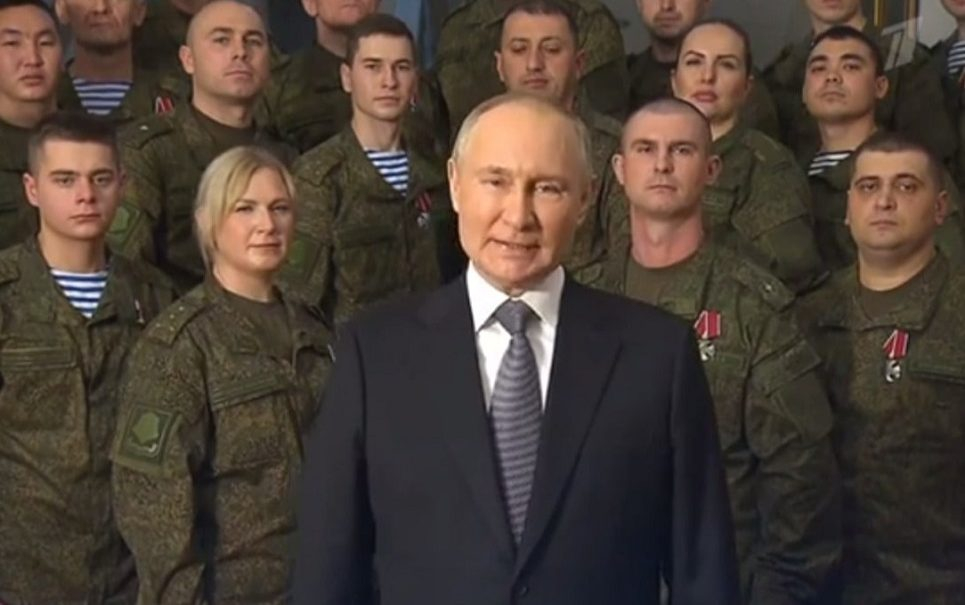 Во время новогоднего обращения за Президентом России Владимиром Путиным стояли военные, отличившиеся в ходе спецоперации и награжденные в этот день государственными наградами в штабе Южного военного округа.