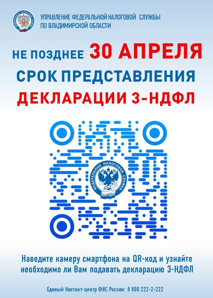 УФНС России по Владимирской области напоминает, что подать декларацию 3-НДФЛ за 2024 год необходимо не позднее 30 апреля 2025 года.