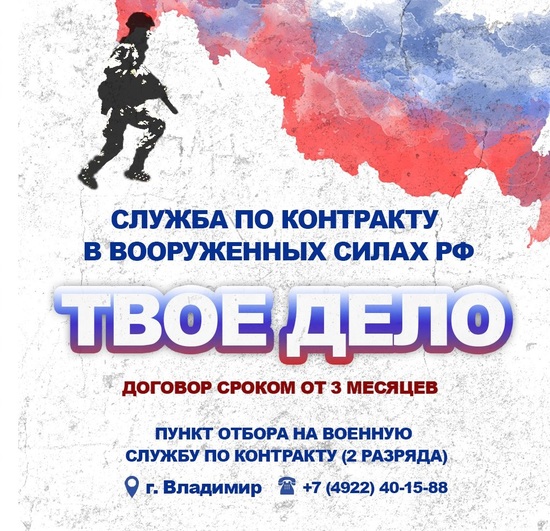 Военный комиссариат Киржачского района совместно с Пунктом отбора на военную службу по контракту Владимирской области 19 мая с 14-00 до 18-00 в Киржачском районном Доме культуры проводят встречу с гражданами для информир