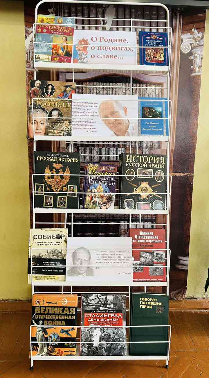 В преддверии Нового учебного года сотрудниками ГБИЦ оформлена выставка историко-патриотической тематики «О Родине, о подвигах, о славе…». Среди представленных изданий труды авторитетных русских историков Н.М. Карамзина «История государства российского» и Н.И. Костомарова «Русская история», а также современные (И.А. Монахова «Основание русского государства», «История русской армии: современная версия», «Великие россияне»: энциклопедия) и другие книги.