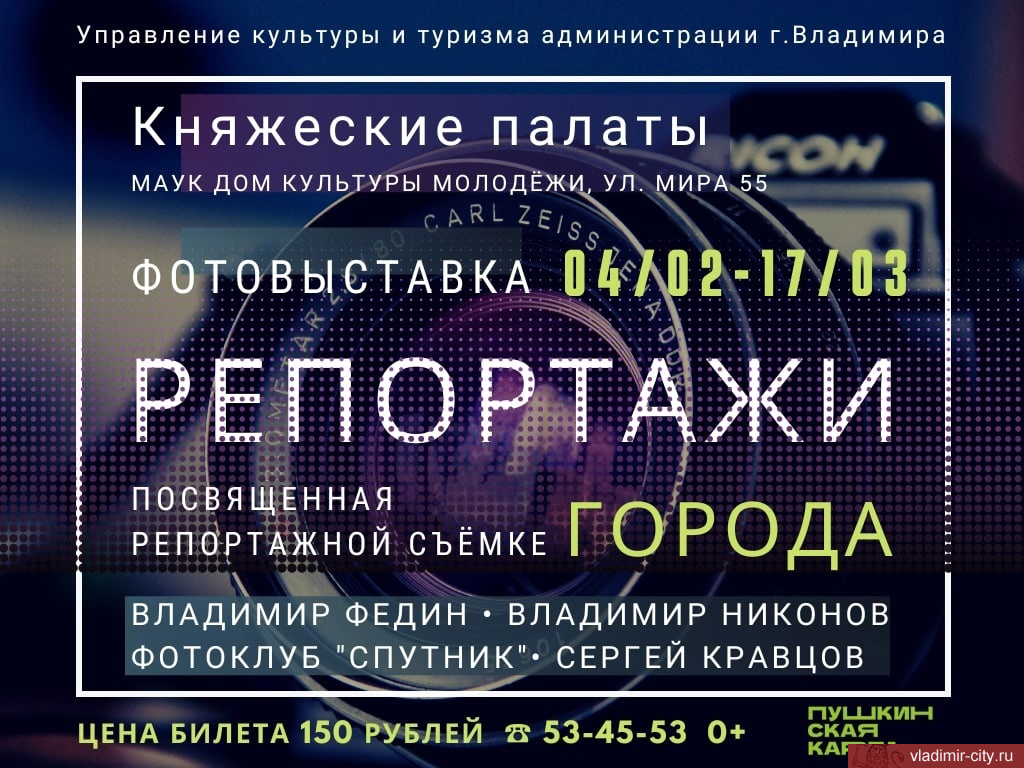 Во владимирском муниципальном Доме культуры молодежи (ул. Мира, 55) открылась выставка репортажной фотографии. В проекте участвуют известные фотографы Владимир Федин, Владимир Никонов, участники фотоклуба «Спутник» и многие другие.