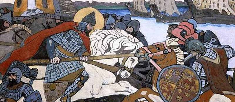О том часе летописец скажет: «Была брань крепка зело и сеча зла». В самый разгар яростной сечи сошлись два предводителя противоборствующих сил — новгородский князь и будущий правитель Шведского королевства Биргер. То был рыцарский поединок двух полководцев средневековья, от исхода которого зависело очень многое. Таким и изобразил его на своем историческом полотне замечательный художник Николай Рерих.