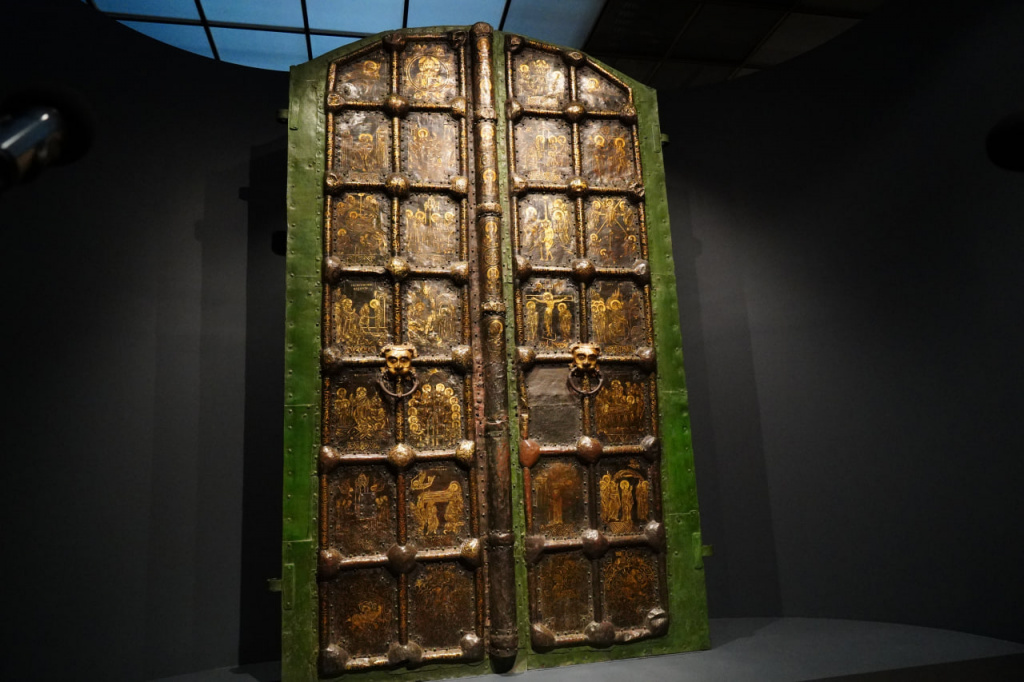 Один из центральных экспонатов - западные Златые врата суздальского Богородице-Рождественского собора. Выполненные в 1230-х годах в технике «золотой наводки», распространенной в средневековой Северной Европе, они являются древнейшим памятником подобного рода, созданным на территории Руси. Всего выполненных в такой технике дверей сохранилось меньше десятка, в том числе новгородские Васильевские врата, привезенные Иваном Грозным и оставленные в Александровской слободе, и двери Успенского и Благовещенского соборов Московского кремля. Техника «золотой наводки» или огневого золочения была довольно популярная в XI-XIII веках в Центральной Европе. Сначала медные листы покрывались сложным по составу лаком, затем на них стилом процарапывали рисунок. Затем они нагревались до 600-700 градусов, после чего в них втиралась амальгама из золота, растворенного в ртути. Полученная смесь заполняла нанесенный рисунок. За все время своего бытования суздальские Златые врата реставрировались лишь однажды, в XVIII веке, когда их перенесли с деревянной основы на железную.