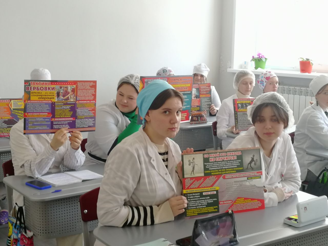Была изучена организационная структура и принципы функционирования террористических организаций, признаки, которые могут помочь определить вербовщика, а также способы противостоять вербовке. В рамках бесед также был использован информационный материал, соответствующий тематике встречи. Студенты активно участвовали в беседе, отвечали на вопросы и оформили тематический стенд.